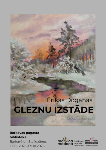 8. decembris 10:00 - 9. janvāris 17:00 Barkavas pagasta bibliotēkā skatāma mākslas studijas “Cesvaine” vadītājas, Madonas mākslas skolas pedagoģes Ērikas Doganas gleznu izstāde.