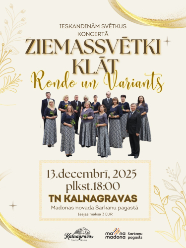 18. maijs 10:00 - 31. decembris 17:00Izstāde “Sargiet savu latviešu biti”/Fr. Galenieks/7. jūlijs 10:00 - 30. decembris 17:00Izstāde "Kalendāri" Bērzaunē25. jūlijs 09:00 - 24. decembris 17:00Gleznu izstāde – Pēters Jansens “Laika Lauks” 1. oktobris 10:00 - 4. janvāris 16:00Izstāde "Pie kafijas tases"10. oktobris 10:00 - 9. janvāris 17:00Izstāde “NOSPIEDUMI. Vitas Mālnieces grafika”5. novembris 09:00 - 30. decembris 17:00Izstāde “Manas zemē iesētās dienas” Kraukļu bibliotēkā5. novembris 09:00 - 30. decembris 17:00Inas Ikaunieces “Tamborēto cilpiņu kompānija” Kraukļu bibliotēkā8. novembris 13:00 - 4. janvāris 16:00TLMS “Ērgļi” 50 gadi krāsu dzīparos30. novembris 16:00 - 4. marts 17:00Izstāde "Pērļu cirks ar kroņiem, spārniem un gariem" 2. decembris 09:00 - 30. decembris 17:00Ziemassvētku dāvanu izstāde – tirdziņš Dzelzavas pagasta bibliotēkā7. decembris 14:00 - 4. marts 17:00Izstāde "Gadskārtas" Cesvaines pilī8. decembris 10:00 - 23. decembris 16:00Grāmatu Ziemassvētku laimes aka8. decembris 10:00 - 9. janvāris 17:00Ērikas Doganas gleznu izstāde14. decembris 14:00 - 1. marts 17:00Ata Ieviņa personālizstāde “No krātuves” Cesvaines pilī15. decembris 10:00 - 23. decembris 18:00Ziemassvētku dāvanu izstāde - tirdziņš Kalsnavā16. decembris 10:00 - 22. decembris 17:00Ziemassvētku tirdziņš Ērgļos20. decembris 22:00 - 21. decembris 02:00Balle Praulienā ar grupu "Mitrokhin's Master Band"21. decembris 12:30 - 14:00Koncerts “Baltā gaidīšana” Cesvainē21. decembris 13:00 - 14:30Ziemassvētku dziesmu koncerts “Ar mīlestību nācis” Varakļānos21. decembris 13:00 - 17:00Cesvaines pils aicina uz ģimenisku pēcpusdienu Ziemassvētku gaidās21. decembris 15:00 - 16:30Ziemassvētku koncerts Mētrienā21. decembris 16:00 - 19:00Labo darbu koncerts "Rūķu nams" Barkavā21. decembris 17:00 - 18:30Ziemas saulgriežu koncerts Vestienā21. decembris 18:00 - 19:15Ziemassvētku uzvedums Degumniekos21. decembris 18:00 - 19:30Rīgas pareizticīgo kamerkora "BLAGOVEST" koncerts "Svētā nakts"