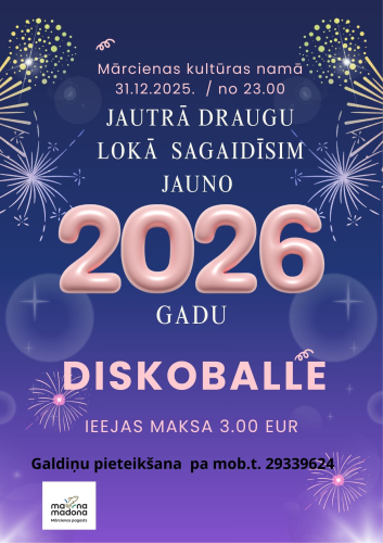 18. maijs 10:00 - 31. decembris 17:00Izstāde “Sargiet savu latviešu biti”/Fr. Galenieks/7. jūlijs 10:00 - 30. decembris 17:00Izstāde "Kalendāri" Bērzaunē25. jūlijs 09:00 - 24. decembris 17:00Gleznu izstāde – Pēters Jansens “Laika Lauks” 1. oktobris 10:00 - 4. janvāris 16:00Izstāde "Pie kafijas tases"10. oktobris 10:00 - 9. janvāris 17:00Izstāde “NOSPIEDUMI. Vitas Mālnieces grafika”23. oktobris 09:00 - 18. decembris 17:00Ņinas Truhanovas gleznu izstāde Aizpurvē24. oktobris 13:00 - 7. decembris 16:00Izstāde ”Pasaule bez robežām. Bauhaus vēstneši.”31. oktobris 10:00 - 14. decembris 16:00Kur dzimst gaisma, tur atmostas cerība1. novembris 15:00 - 16. decembris 17:00Rīgas Lutera draudzes mākslinieku, Jāņa Akuratera muzeja un Pētera Upīša Dārzkopības muzeja izstāde “Dārzs” Jumurdā5. novembris 09:00 - 30. decembris 17:00Izstāde “Manas zemē iesētās dienas” Kraukļu bibliotēkā5. novembris 09:00 - 30. decembris 17:00Inas Ikaunieces “Tamborēto cilpiņu kompānija” Kraukļu bibliotēkā8. novembris 13:00 - 4. janvāris 16:00TLMS “Ērgļi” 50 gadi krāsu dzīparos13. novembris 09:00 - 18. decembris 17:00Kristīnes Kukurānes kolekcijas izstāde “Ceļojumu pastkartes, suvenīri un 1001 pildspalva” Aizpurvē30. novembris 16:00 - 4. marts 17:00Izstāde "Pērļu cirks ar kroņiem, spārniem un gariem" 2. decembris 09:00 - 30. decembris 17:00Ziemassvētku dāvanu izstāde – tirdziņš Dzelzavas pagasta bibliotēkā6. decembris 09:30 - 15:00R. Blaumaņa Literārās prēmijas 21. konkursa noslēguma pasākums6. decembris 14:00 - 15:40Izrāde “Viss par vīriešiem” Sauleskalnā6. decembris 16:00 - 17:48Kinoseanss ''Zootropole 2''6. decembris 16:00 - 18:00“Ceļā uz svētkiem” eglītes iedegšanas pasākums Vestienā6. decembris 18:00 - 19:50Kinoseanss ''Tīklā: TTT leģendas atdzimšana''6. decembris 18:00 - 19:30Izrāde kriminālkomēdija “Briksdāles ledājs” Lubānā6. decembris 18:00 - 19:30Deju kolektīvu sadancis Kalnagravās6. decembris 18:00 - 19:30Deju koncerts "Pagrieziens" Madonā6. decembris 18:00 - 19:30Ļaudonas pagasta Ziemassvētku eglītes iedegšana6. decembris 22:00 - 7. decembris 02:00Atpūtas vakars – balle kopā ar grupu “Zelta kniede” Sauleskalnā