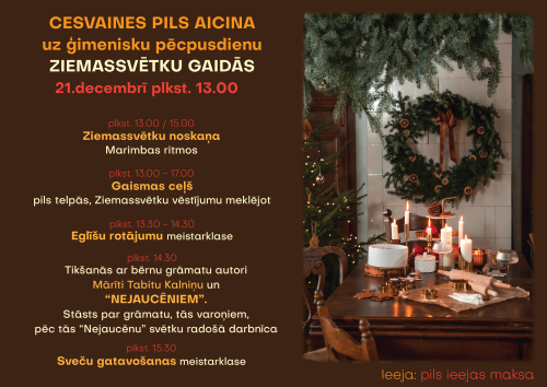 21. decembris 13:00 - 17:00 Svētdien, 21. decembrī, plkst. 13.00 Cesvaines pilī notiks pasākums ģimenēm, kura laikā būs iespējams piedalīties tematiskās meistarklasēs, radošās aktivitātēs, baudīt mūziku un satikt Ziemassvētku vecīti. Tāpat gaidāma tikšanās ar grāmatas “Nejaucēni” autori Mārīti Tabitu Kalniņu.