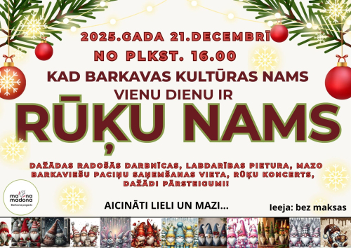 21. decembris 16:00 - 19:00 21. decembrī Barkavas kultūras nams pārvērtīsies brīnumainā Rūķu namā, kur ikviens – gan liels, gan mazs – varēs ielūkoties rūķu ikdienā un uzzināt, kā top Ziemassvētku brīnumi.