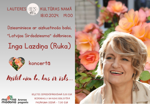 18. oktobris 19:00 - 20:00Tautā iemīļotā dziesminiece ar aizkustinošo balsi, "Latvijas Sirdsdziesma" dalībniece Inga Lazdiņa (Ruka) – guvusi atpazīstamību ar tādām dziesmām kā „Dziesmas sirds”, „Reiz es cerēju”, „Dziesma rudenīgā”, „Ko man ar tevi padarīt”, kā arī daudzām citām.