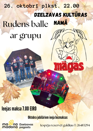 26. oktobris 22:00 - 27. oktobris 03:00 Rudens balle kopā ar grupu “Māgas”. Grupa ir tepat no Sarkaņu pagasta un rūpēsies par kvalitatīvu muzikālo noformējumu visa vakara, nakts garumā. Spēlēs gan visiem zināmo estrādes zelta fondu izlasi, gan pašu labākos gabalus.