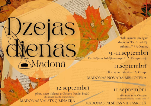 9. septembris 10:00 - 12. septembris 12:00Atzīmējot Dzejas dienas, Madonas novada bibliotēka piedāvā tikties ar tādiem dzejniekiem kā A.Ostups un Žebers (Andris Breže).
