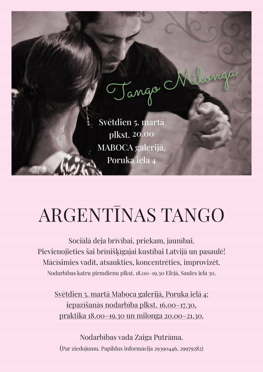 Argentīnas tango – sociālā deja brīvībai, priekam, jaunībai. Pievienojieties šai brīnišķīgajai kustībai Latvijā un pasaulē! Mācīsimies vadīt, atsaukties, koncentrēties, improvizēt.