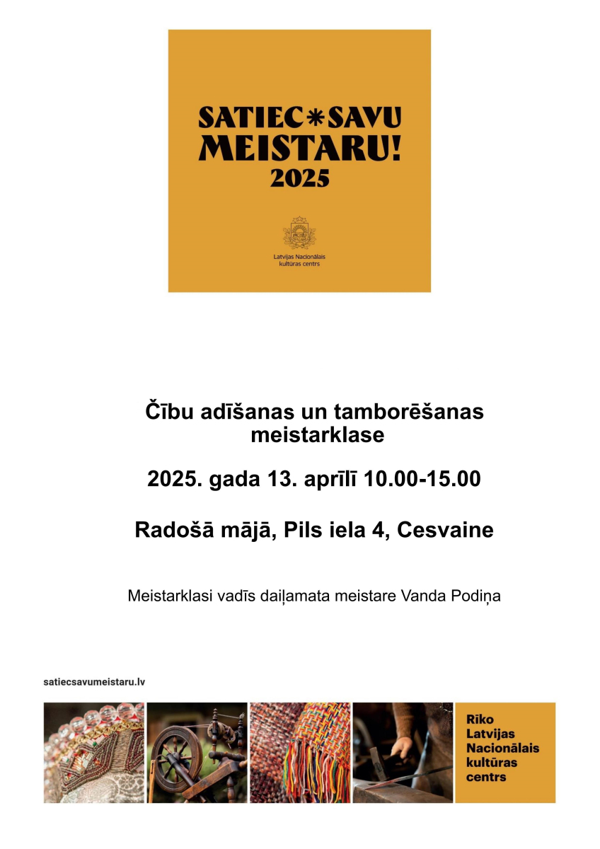 Latvijas Nacionālā kultūras centra (LNKC), pašvaldību un amatu meistaru kopīgi rīkotais pasākums “Satiec savu meistaru!” šogad pulcēs meistarus un “mācekļus” vairāk nekā 200 norišu vietās: 5. un 6. aprīlī Kurzemē un Zemgalē; 12. un 13. aprīlī Vidzemē un Sēlijā; 26. un 27. aprīlī Rīgā un Latgalē.