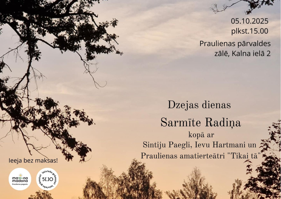 Praulienas pagasta bibliotēka sadarbībā un Saikavas tautas namu aicina uz Dzejas dienu pasākumu, lai tuvāk iepazītu dzejnieci un viņas dzeju - gan Sarmītes, gan Praulienas amatierteātra “Tikai tā” dalībnieku izpildījumā. Par dziesmām un mūziku gādās Sintija Paegle un Ieva Hartmane.