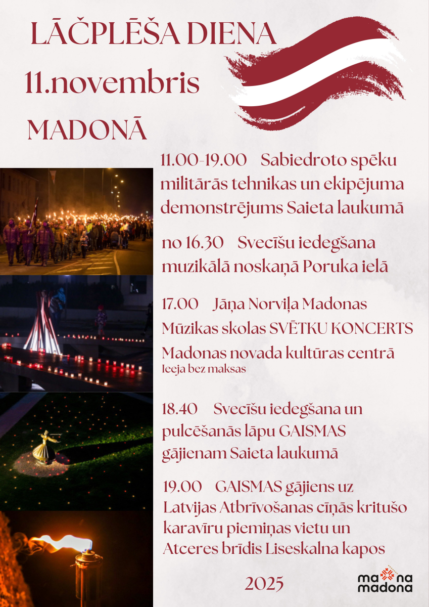 - plkst. 19.00 dziesmots GAISMAS gājiens uz Latvijas Atbrīvošanas cīņās kritušo karavīru piemiņas vietu un Atceres brīdis Liseskalna kapos. Gājienu ar skanīgām un patriotiskām melodijām pavadīs Madonas Valsts ģimnāzijas audzēkņi un Madonas novada kultūras centra Senioru koris “Mantojums”. Pēc piemiņas brīža tiks nodrošināts autobuss, kas nogādās gājiena dalībniekus atpakaļ Saieta laukumā.