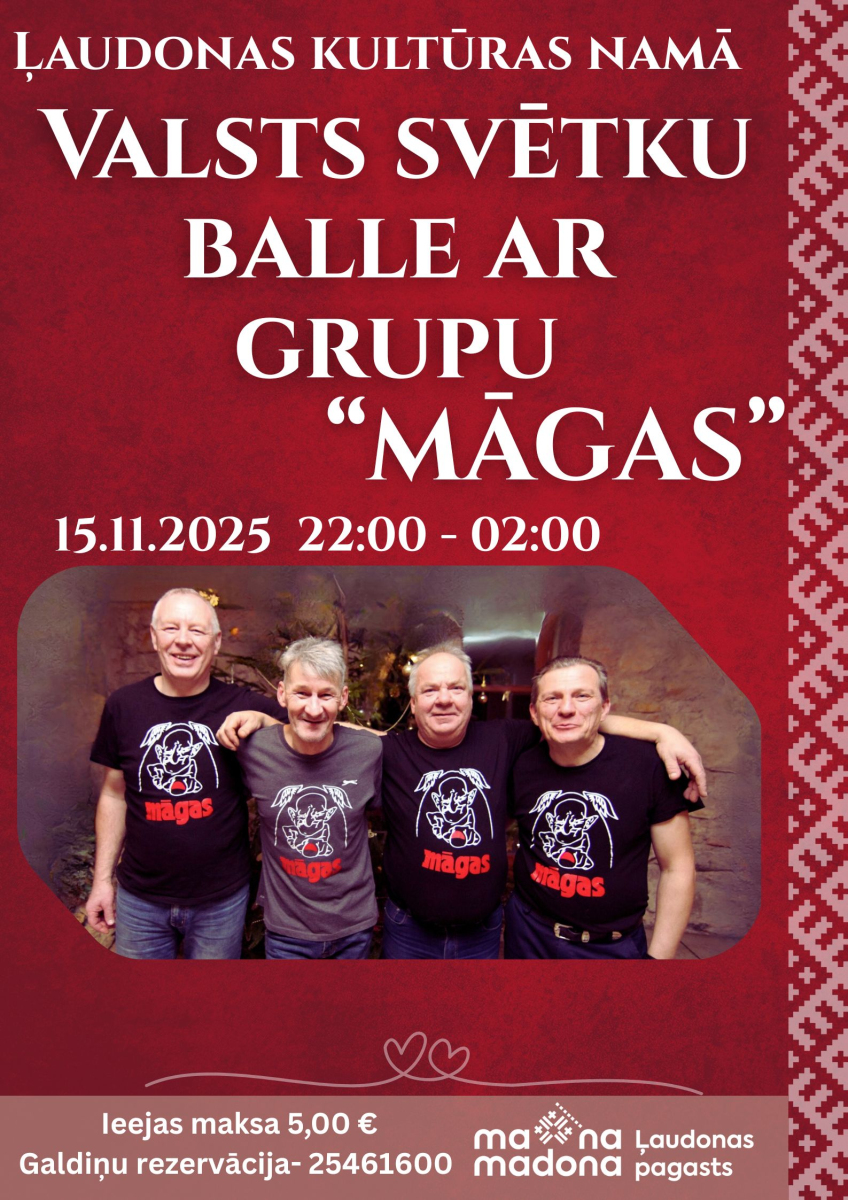 Pēc svinīgā valsts svētku koncerta aicinām ikvienu ļaudonieti un viesi uz valsts svētku balli kopā ar atraktīvo un muzikālo grupu “MĀGAS”!