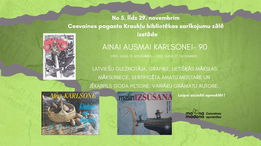 Aicinām uz izstādi, kuras pamatā ir novadnieces biogrāfija, viņa ir bijusi ļoti darbīga personība- grafiķe, gleznotāja, lietišķās mākslas māksliniece, sertificēta amatu meistare, vairāku grāmatu autore. Izstāde veidota tikai no Cesvaines pagasta Kraukļu bibliotēkas novadpētniecības krājumā esošajiem materiāliem- 6 planšetes.