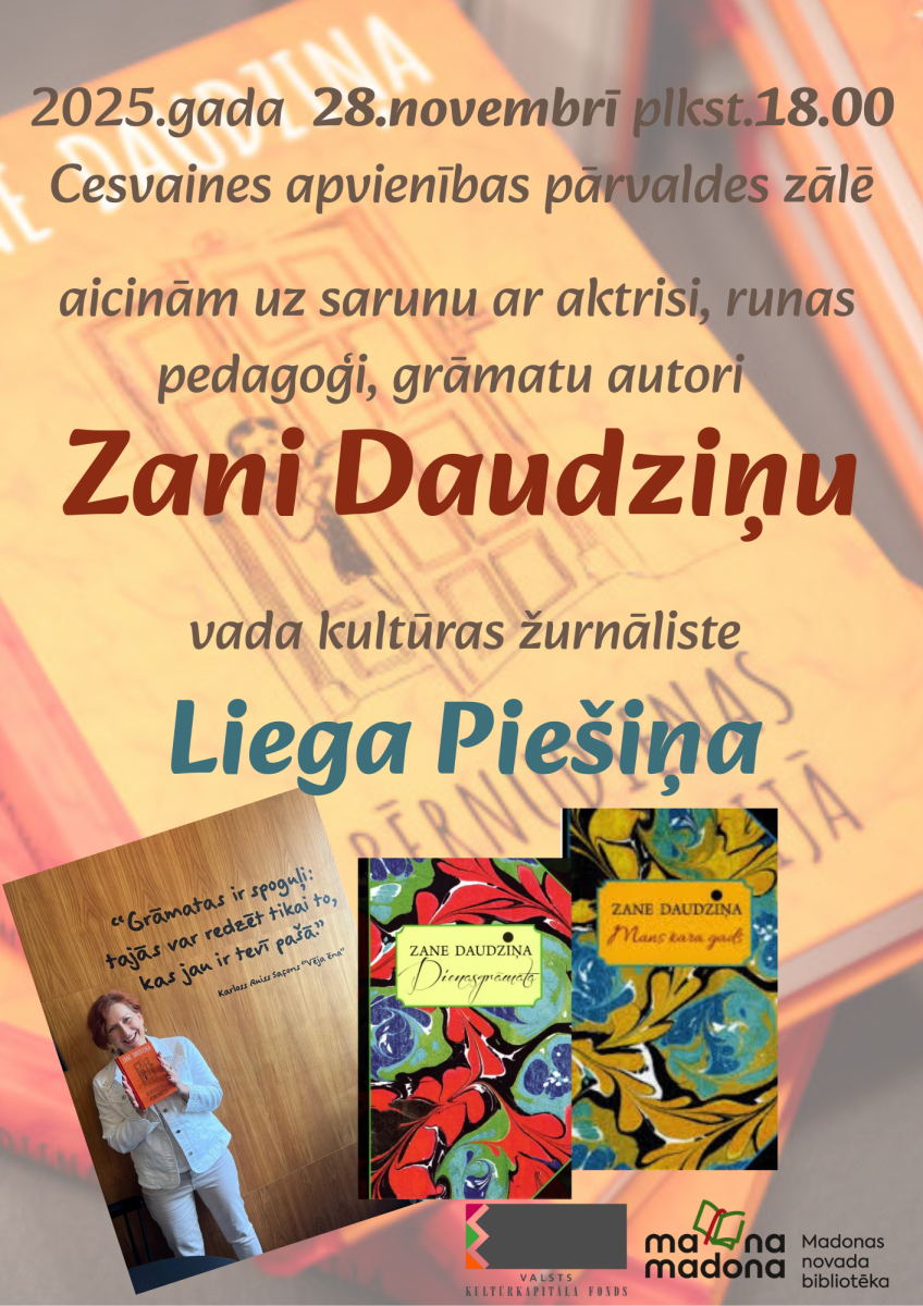 Aicinām uz Valsts kultūrkapitāla fonda atbalstītu tikšanos ar runas pedagoģi, latviešu teātra un kino aktrisi un grāmatu autori Zani Daudziņu un kultūras žurnālisti, Rakstniecības un mūzikas muzeja izglītojošā darba vadītāju Liegu Piešiņu.