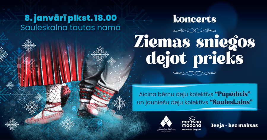 8. janvārī uz koncertu “Ziemas sniegos dejot prieks” aicina Sauleskalna tautas nama bērnu deju kolektīva “Pūpēdītis” un jauniešu deju kolektīva “Sauleskalns” dalībnieki.