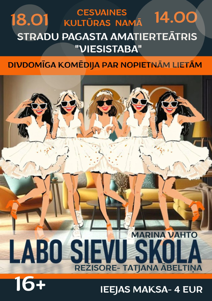 18. janvārī plkst. 14.00 Cesvaines kultūras namā viesosies Stradu pagasta amatierteātris “Viesistaba” ar divdomīgu komēdiju par nopietnām lietām – “Labo sievu skola” (autore Marina Vahto, režisore Tatjana Ābeltiņa).