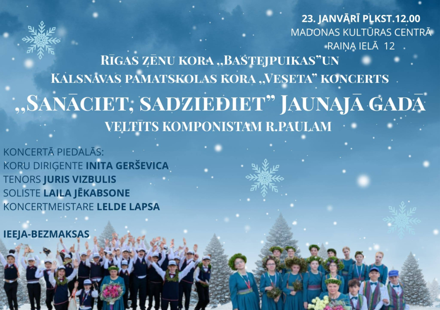 Esiet aicināti uz kormūzikas koncertu "Sanāciet, sadziediet" Jaunajā gadā, kas veltīts komponista Raimonda Paula 90gadu jubilejai, Madonas novada kultūras centrā 23. janvārī plkst. 12.00.