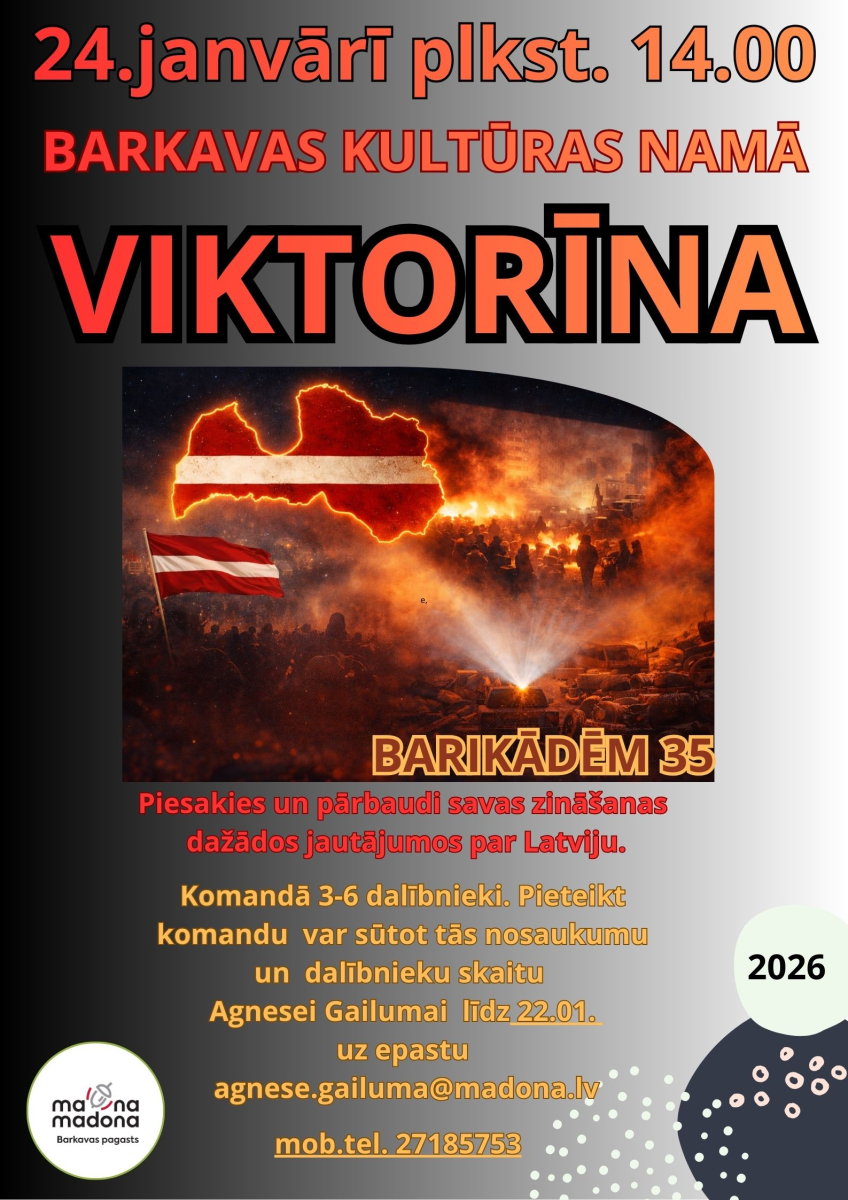 2026. gadā aprit 35 gadi kopš Latvijas barikāžu laika – notikumiem, kas kļuva par nozīmīgu pagrieziena punktu mūsu valsts neatkarības atjaunošanas ceļā. Atzīmējot šo gadadienu, 24. janvārī plkst. 14.00 Barkavas Kultūras namā notiks izzinoša un aizraujoša viktorīna, kas aicina ikvienu pārbaudīt savas zināšanas par Latvijas vēsturi, kultūru un nozīmīgiem notikumiem.