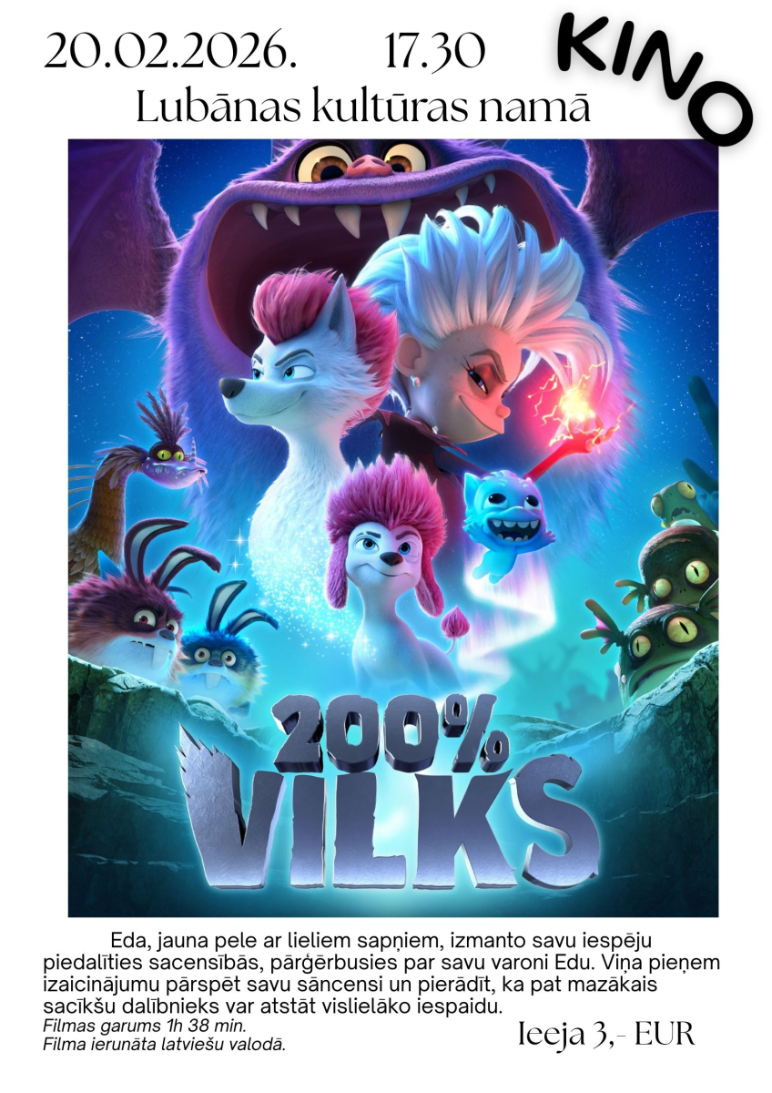 Animācijas filmas “200% vilks” kinoseanss Lubānas kultūras namā - 20. februārī plkst. 17.30.