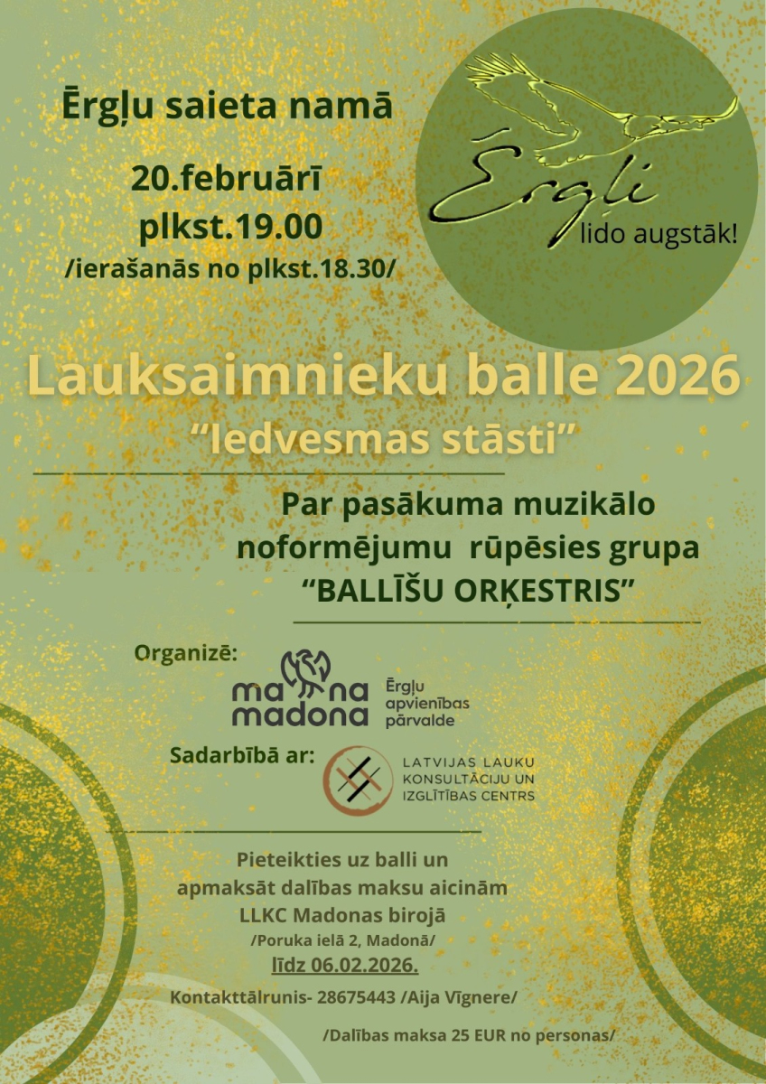 20. februārī plkst. 19.00 Ērgļu Saieta namā norisināsies īpašs notikums - Madonas novada pašvaldība un Latvijas Lauku Konsultāciju un izglītības centra Madonas birojs, sadarbībā ar Ērgļu apvienības pārvaldi uz tradicionālo kopā būšanas pasākumu “Lauksaimnieku balli 2026” aicina zemnieku saimniecību īpašniekus un lauku uzņēmējus.