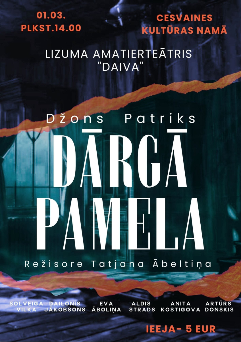 1.martā plkst. 14.00 Cesvaines kultūras namā viesosies Lizuma amatierteātris “Daiva” ar izrādi “Dārgā Pamela”.