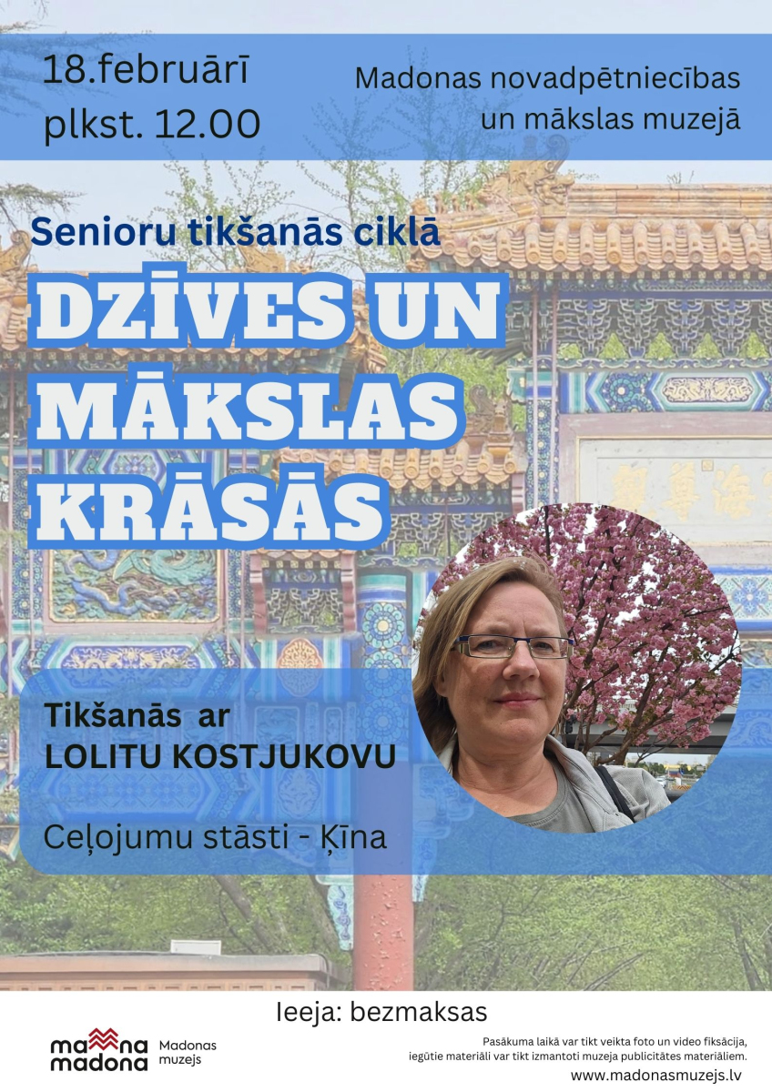 Novadniece Lolita Kostjukova ir kaislīga ceļotāja – eksotiskas valstis, piedzīvojumi un elpu aizraujoši skati. Tikšanās laikā iespēja virtuāli ceļot uz Ķīnu – iepazīstot tās kultūru, ievērojamākās vietas un Lolitas ceļojuma piezīmes.