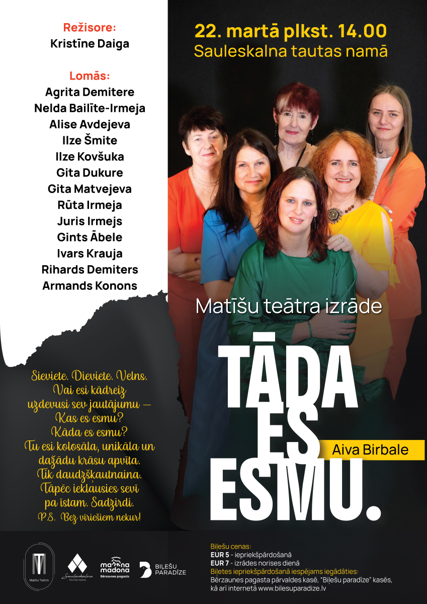 22. martā plkst. 14.00 Sauleskalna tautas namā skatītāji aicināti uz Matīšu amatierteātra izrādi pēc dramaturģes Aivas Birbeles lugas “Tāda es esmu” motīviem.