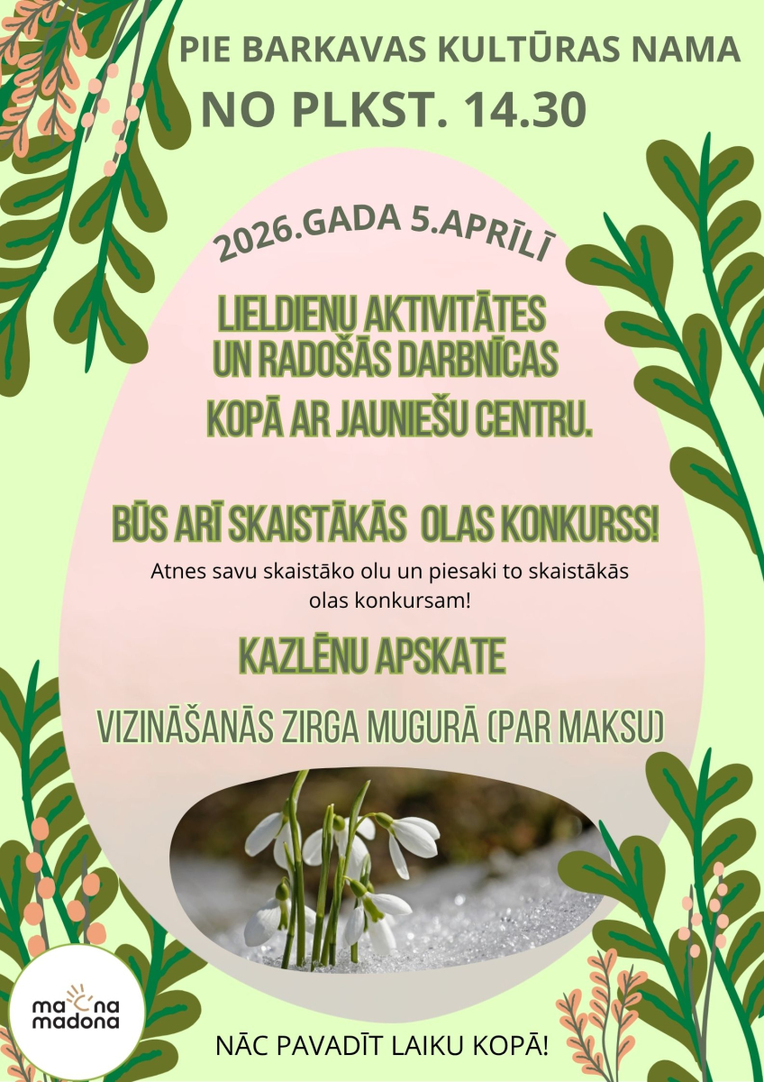Pasākuma laikā apmeklētājiem būs iespēja iesaistīties dažādās radošās nodarbēs, kas piemērotas visai ģimenei, kā arī baudīt pavasarīgu atmosfēru un kopā būšanas prieku. Īpašs notikums būs skaistākās Lieldienu olas konkurss, kurā ikviens aicināts piedalīties, atnesot savu krāsotāko vai oriģinālāko olu.