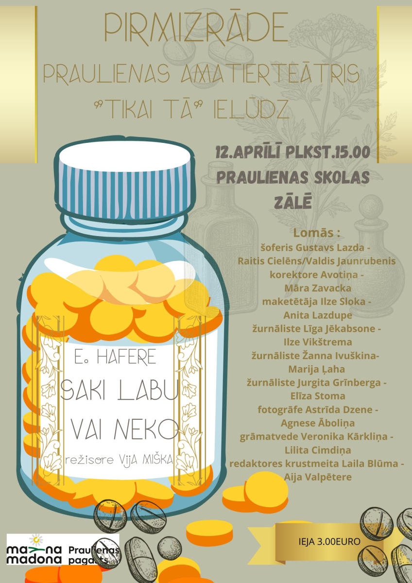 Praulienas amatierteātris “Tikai tā” ielūdz uz E. Haferes lugas “Saki labu vai neko’’ pirmizrādi.