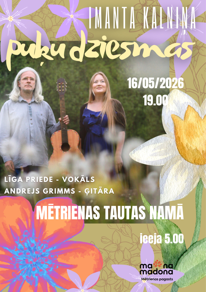 Mētrienas tautas namā ar skaistu koncertu “Imanta Kalniņa puķu dziesmas” uzstāsies Līga Priede un Andrejs Grimms. Tas būs veltījums Mātes dienai un pavasarim.