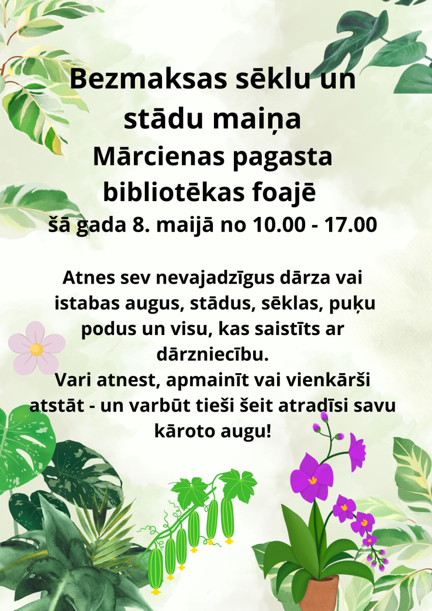 Piedāvājam iedzīvotājiem padalīties ar stādiem, sēklām, istabas augiem un visu, kas saistīts ar dārzniecību. Vari vienkārši atnest, apmainīt - un varbūt atradīsi savu kāroto augu.