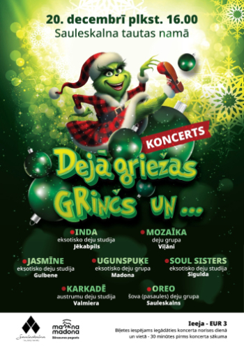 20. decembris 16:00 - 17:30; Sauleskalna tautas nams; Bērzaune20. decembrī plkst. 16.00 uz koncertu aicina septiņas deju grupas, lai caur eksotiskiem deju ritmiem meklētu Ziemassvētku burvību un svinētu svētkus citādākos - pasaules ritmos.