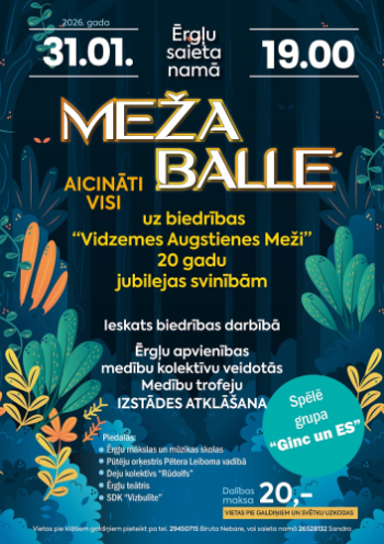31. janvāris 19:00 - 1. februāris 02:00; Ērgļu saieta nams; Ērgļi2026. gada 31. janvārī plkst. 19.00 Ērgļu Saieta namā norisināsies īpašs notikums – Meža balle, kurā tiks atzīmēta biedrības “Vidzemes Augstienes Meži” 20 gadu jubileja.