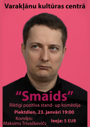 23. janvāris 19:00 - 20:15; Varakļānu kultūras centrs; VarakļāniMaksims Trivaškevičs piedāvā savu jaunāko stand- up komēdijas izrādi „Smaids”, kura 4. augustā piedzīvoja pirmizrādi un tagad tiek aktīvi demonstrēta latviski runājošiem indivīdiem visā pasaulē.