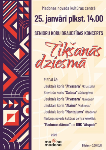 25. janvāris 14:00 - 15:30; Madonas novada kultūras centrs; MadonaSenioru koru drauzības koncerts "Tikšanās dziesmā" Madonas novada kultūras centrā 25. janvārī plkst. 14.00.