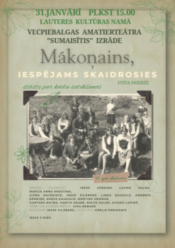 31. janvāris 18:00 - 20:00; Ļaudonas kultūras nams; Ļaudona31. janvārī plkst. 18.00 Ļaudonas Kultūras namā skatītāji aicināti uz Sarkaņu pagasta amatierteātra “Pinģerots” izrādi – Marikas Pudules-Indānes lugu “Žubītes testaments”.