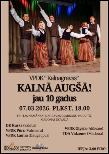 7. marts 18:00 - 19:30; Tautas nams "Kalnagravas"; SarkaņiVPDK “Kalnagravas” savu 10. sezonas sadanci atzīmēs kopā ar draugiem no Kurzems, Vidzemes un Latgales, lai kopā izdejotu skaistu koncertu un vēlreiz uzsauktu “Kalnā augšā!”.
