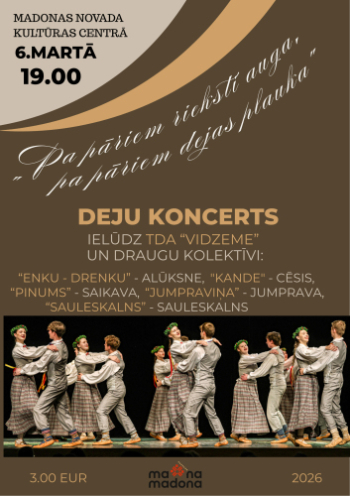 6. marts 19:00 - 20:30; Madonas novada kultūras centrs; MadonaMadonas novada kultūras centra TDA "Vidzeme" ar draugu kolektīviem ielūdz uz deju koncertu "Pa pāriem rieksti auga, pa pāriem dejasplauka" 6. martā plkst. 19.00.