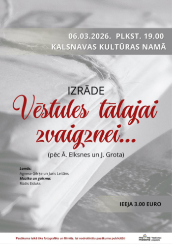 6. marts 19:00 - 20:30; Kalsnavas kultūras nams; KalsnavaKalsnavas kultūras namā skatītāji aicināti uz izrādi “Vēstules tālajai zvaigznei…”, kas veltīta mūžīgajām vērtībām – mīlestībai un uzticībai.
