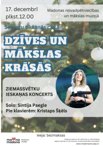 17. decembris 12:00 - 13:00; Madonas novadpētniecības un mākslas muzejs, Izstāžu zāles; MadonaMadonas muzejs aicina uz senioru tikšanos ciklā "Dzīves un mākslas krāsās" pirmssvētku noskaņā, kur ar muzikāliem priekšnesumiem priecēs Sintija Paegle un Kristaps Šķēls.