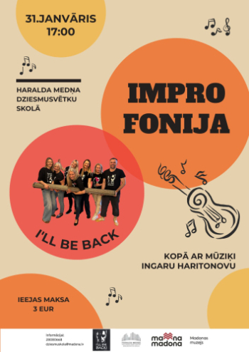 31. janvāris 17:00 - 19:00; Haralda Medņa Dziesmusvētku skola; Prauliena31. janvārī plkst. 17.00 Haralda Medņa Dziesmusvētku skolā notiks radošs un muzikāls improvizācijas pasākums “Impro fonija”. Tā ir īpaša tikšanās, kurā mūzika, vārds un spontanitāte savijas vienotā notikumā.