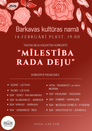 14. februāris 19:00 - 20:30; Barkavas kultūras nams; BarkavaAicinām uz īpašu tautas deju kolektīvu koncertu “Mīlestība rada deju”, kurā satiksies deja, mūzika un kopā būšanas prieks. Valentīna dienas noskaņās skatītājiem tiks dāvāts sirsnīgs, krāšņs un enerģijas pilns koncerts, kas apliecinās – mīlestība patiesi rada deju.