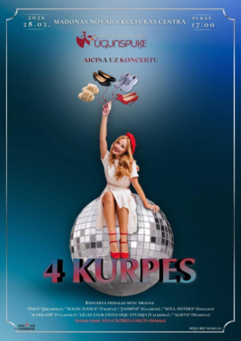 28. marts 17:00 - 18:30; Madonas novada kultūras centrs; MadonaŠī gada 28. martā Eksotisko deju studija “Ugunspuķe” aicina savus skatītājus uz daudzveidīgu, spilgtu koncertu “4 kurpes”, kurā uzstāsies dažādu pilsētu un dažādu deju stilu kolektīvi.