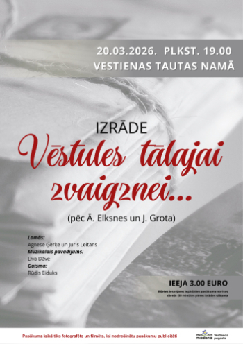 20. marts 19:00 - 20:30; Vestienas tautas nams; Vestiena20. martā plkst. 19.00 Vestienas tautas namā skatītāji aicināti uz izrādi “Vēstules tālajā zvaigznē…”, kas veltīta mūžīgajām vērtībām – mīlestībai un uzticībai.