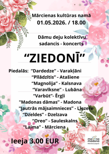2. maijs 15:00 - 17:00; Cesvaines kultūras nams; CesvaineDāmu deju grupa “Kamenes” vadītājas Ilzes Purpļevičas vadībā aicina uz īpašu notikumu – savu 25 gadu jubilejas koncertu “Kamenes stāsts ziedošā pļavā”, kas notiks 2. maijā plkst. 15.00 Cesvaines kultūras namā.
