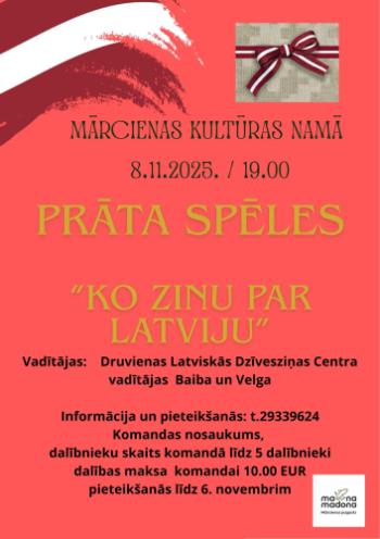 8. novembris 19:00 - 22:00; Mārcienas kultūras nams; MārcienaJa vēlaties pārbaudīt savas zināšanas par Latviju, esiet laipni aicināti uz Mārcienas kultūras namu, tur notiks prāta spēles.