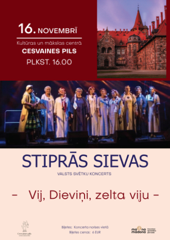 16. novembris 16:00 - 18:00; Kultūras un mākslas centrā Cesvaines pils; CesvaineAnsamblis “Stiprās sievas” valsts svētku priekšvakarā ar tautasdziesmām un melodijām no Folkloras kustības laika pieskandinās Cesvaines pili, aicinot klausītājus sadziedāties un būt kopā, sagaidot Latvijas dzimšanas dienu.