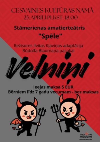 25. aprīlis 18:00 - 19:30; Cesvaines kultūras nams; Cesvaine25. aprīlī plkst. 18.00 Cesvaines kultūras namā skatītājiem būs iespēja noskatīties Stāmerienas amatierteātra “Spēle” izrādi, kas tapusi pēc rakstnieka Rūdolfs Blaumanis pasakas “Velniņi” motīviem.