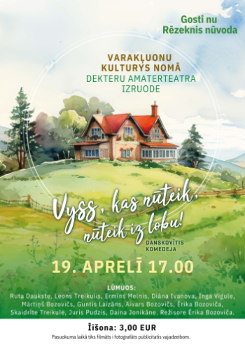 19. aprīlis 17:00 - 18:30; Varakļānu kultūras centrs; VarakļāniGatavojieties smiekliem un latgaliskam sīkstumam, jo 19. aprīlī plkst. 17.00 Varakļānu Kultūras namā uzstāsies viesi - kaimiņi no Rēzeknes novada - Dekteru amaterteātris! Skatītājiem tiks piedāvāta Danskovītes komēdija "Vyss, kas nuteik, nuteik iz lobu!".