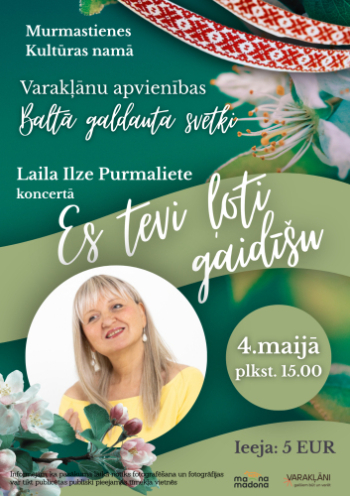 16. maijs 19:00 - 20:30; Mētrienas tautas nams; MētrienaMētrienas tautas namā ar skaistu koncertu “Imanta Kalniņa puķu dziesmas” uzstāsies Līga Priede un Andrejs Grimms. Tas būs veltījums Mātes dienai un pavasarim.
