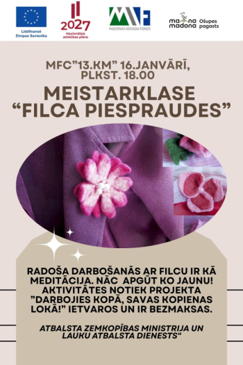 16. janvāris 18:00 - 20:00; OšupeFilcs ir dabīgs materiāls – tas viegli padodas veidošanai, un darbs ar to mēdz būt nomierinošs un meditatīvs. Jau esam darbojušies filca auskaru meistarklasē, un nu ir laiks iemācīties gatavot filca piespraudes.