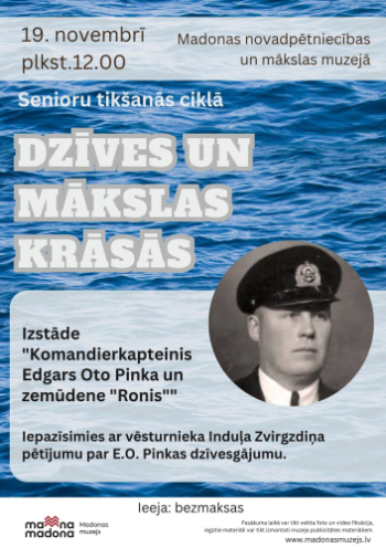 19. novembris 12:00 - 14:00; Madonas novadpētniecības un mākslas muzejs, Izstāžu zāles; Madona19. novembrī plkst.12.00 aicinām pasākumu senioru tikšanās ciklā. Šajā tikšanās reizē atklāsim pirms 130 gadiem Vecgulbenes muižas dzirnavnieka ģimenē dzimušā Edgara Oto Pinkas dzīves mirkļus un devumu inženierzinātņu un mehānikas jomās. Iespēja aplūkot izstādi un iepazīt vēsturnieka Induļa Zvirgzdiņa pētījumu par E.O.Pinkas dzīvesgājumu. Uz tikšanos!