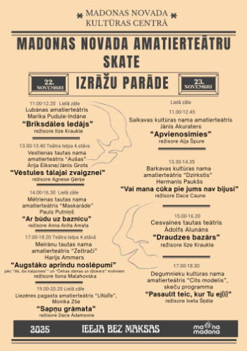 22. novembris 11:00 - 23. novembris 18:30; Madonas novada kultūras centrs; Madona2025. gada 22. un 23. novembrī Madonas novada kultūras centrā deviņi no 21 Madonas novada amatierteātra piedalīsies Madonas novada amatierteātru skatē.